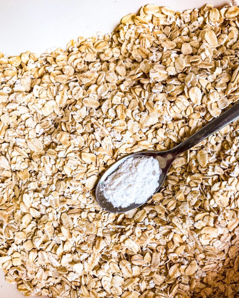 - In a medium size mixing bowl mix oats and baking powder.